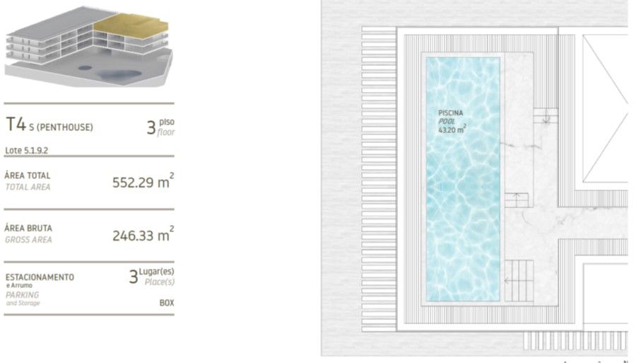 Apartamento T4 PENTHOUSE com piscina privativa em rooftop, inserido em condomínio privado junto à Marina de Vilamoura. Este fantástico apartamento conta com 4 suites, lavandaria e cozinha separada, escritório, varanda a circundar o apartamento, uma casa de banho de serviço, piscina privativa, e, ainda, box com estacionamento para 3 viaturas. O empreendimento: UMA OBRA-PRIMA SARAIVA + ASSOCIADOS Com projeto de arquitetura assinado pelo prestigiado atelier SARAIVA+ASSOCIADOS, este empreendimento apresenta uma linguagem minimalista e depurada, marcada por amplos envidraçados e grande permeabilidade visual. Dois edifícios elevam-se de forma harmoniosa, com varandas que prolongam os interiores sobre amplas zonas verdes e paisagismo cuidado. O VERDADEIRO SIGNIFICADO DE BEM-ESTAR Este empreendimento oferece um estilo de vida que valoriza a calma, o equilíbrio e o conforto absoluto: .Dois edifícios ligados por um jardim privado .Piscinas exteriores + piscina aquecida .Ginásio, sala de massagens e sala de convívio .Áreas exteriores exclusivas e design paisagístico envolvente Um santuário de luxo, pensado para viver devagar, respirar melhor e descansar com qualidade. RESIDÊNCIAS EXCLUSIVAS Três pisos de apartamentos e um piso subterrâneo de estacionamento privado, garantindo espaço, privacidade e funcionalidade. ACABAMENTOS PREMIUM & DETALHE SUPERIOR .Portaria e videovigilância .Até 3 lugares de estacionamento privado por fração .Pontos de carregamento elétrico .Fachadas revestidas em mármore Ibiza .Cozinha totalmente equipada (gama superior) .Ar condicionado por condutas .Blackouts interiores & sistema de sombreamento exterior .Caixilharia minimalista .Pedras naturais .Pavimento em madeira de carvalho .Loiças suspensas e torneiras embutidas .Portas de altura total com dobradiças ocultas .Iluminação LED .Domótica centralizada .Sistema de alarme UM ENDEREÇO DE EXCEÇÃO — CONCLUSÃO PREVISTA PARA 2026 Esta é a oportunidade perfeita para quem procura mais do que uma casa — um estilo de vida. O privilégio de viver onde a tranquilidade é luxo. Fale connosco para saber mais informações.